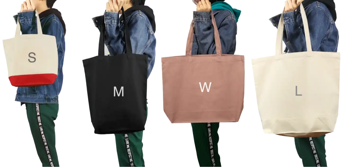 AirPriのバイカラートートのサイズは4種類です。一番小さいものからS、M、W、Lの4つです。こちらは身長170cmのモデルさんにトートバッグを持って頂きました。LサイズやWサイズは大きめなので、ノートパソコンもすっぽり入ります。また大きいサイズはオリジナルデザインができる範囲も大きくなるので、より自分好みにカスタマイズできます。